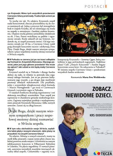 Przy okazji zachęcamy Was także do powrotu do lat ubiegłych i wysłuchania archiwalnych audycji z zespołem. Na stronie radia można znaleźć audycję z 2005 roku – “5 dekad Rock ‘n’ Rolla”, w której około 33 min. można posłuchać rozmowy z Arkiem Wiśniewskim przeprowadzonej podczas koncertu jubileuszowego w Sopocie z okazji 40-lecia Czerwonych Gitar. Muzyk opowiadał m.in. o swoim dołączeniu do składu zespołu w 2003 roku, historii piosenki “Senny szept” oraz swoich muzycznych wzorcach: